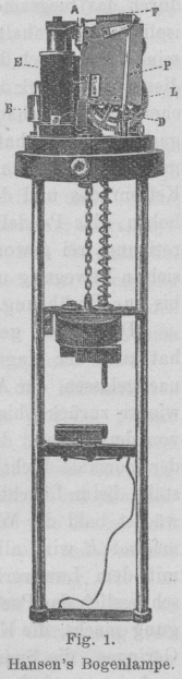 entfernt sich die untere Kohle von der oberen, das Pendel P wird wieder arretirt und der normale Lichtbogen ist hergestellt. Da die