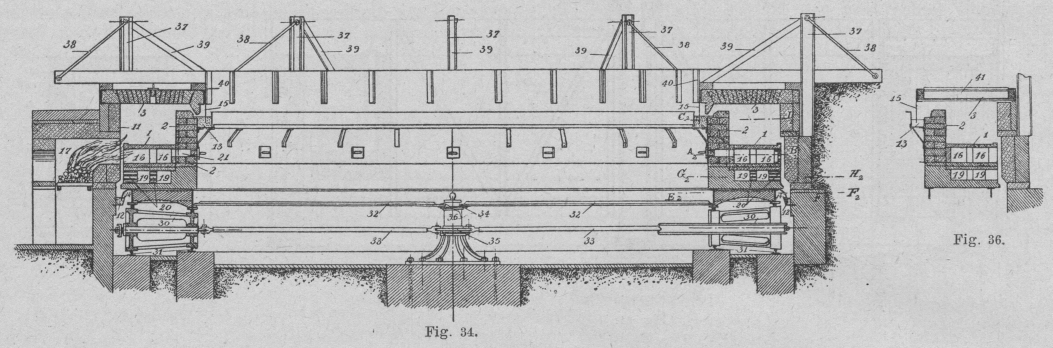 Der Betrieb des Ofens gestaltet sich ähnlich wie der des Siemens'schen Ofens. Die Waren werden den auf der Feuerung 17 entwickelten, zur Esse 22 ziehenden Feuergasen langsam entgegengeführt. Der Schieber 24 regelt den Zug des Schornsteins; die Schieber 23 (Fig. 33 und 35) sperren den