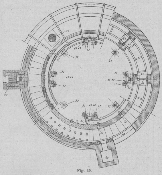 Innenwand 2 und der Decke 3 von einem Eisengerippe getragen, das sich um eine zentrale Welle 5 dreht. Letztere läuft an ihrem unteren Ende in einen