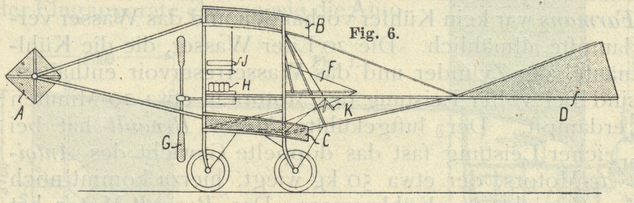 Schwanzfläche. E, F Steuer- und Stabilitätsflächen. G Schraube. H Motor. J