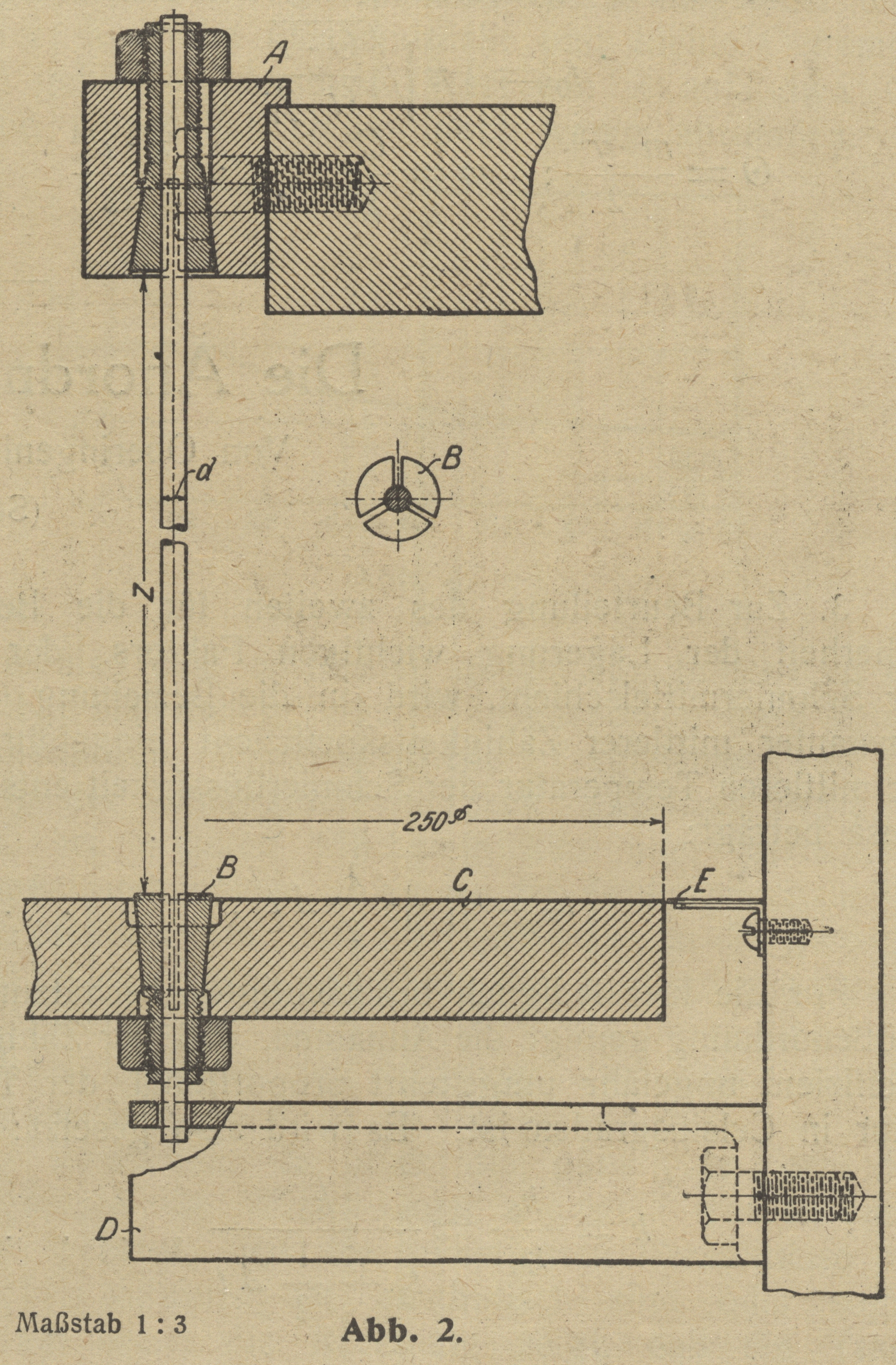 1 und 2) eingespannt. Das untere Drahtende wird durch den Klemmkegel B fest mit der Schwungscheibe C