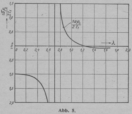 positiven Werte von \frac{1}{2}\,\frac{a\,p_0}{t_1} in Frage; in Abhängigkeit von diesen sind in Abb. 6 die zugehörigen Werte von λ aufgetragen.