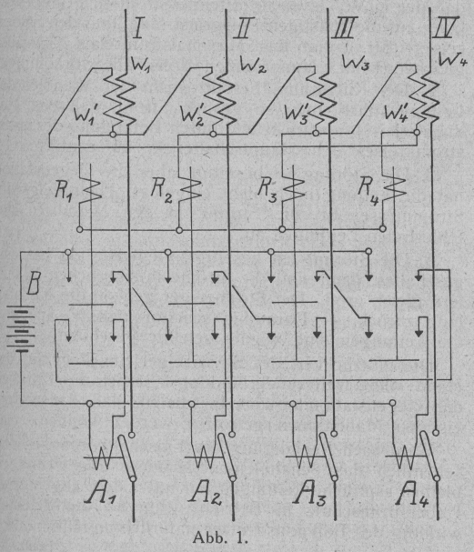 über die Relais R1–R4 zu einem gemeinsamen Mittelpunkte geführt sind. Die Kontakte der Relais