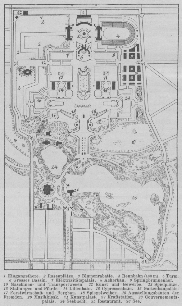 Rennbahn (400 m). 5 Turm. 6 Grosses Bassin. 7 Elektrizitätspalais.